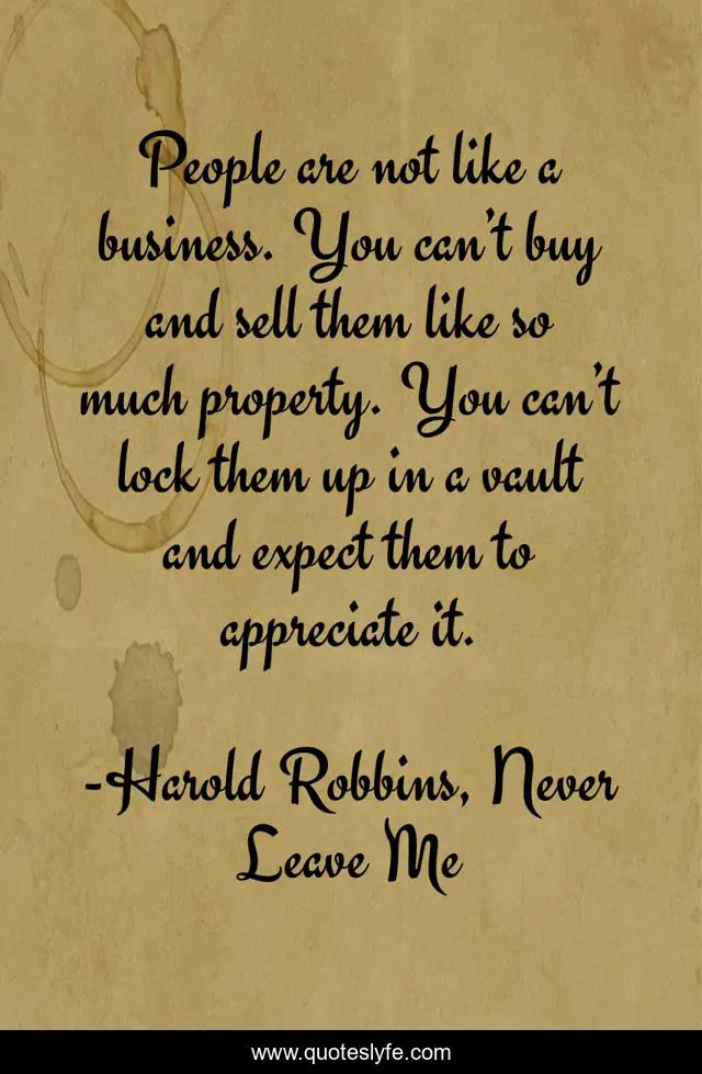 This page presents the quote "People are not like a business. You can’t buy and sell them like so much property. You can’t lock them up in a vault and expect them to appreciate it.". Author of this quote is Harold Robbins, Never Leave Me. This quote is about business, people, lock, appreciate, expect, property,.