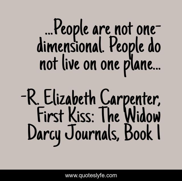 This page presents the quote "...People are not one-dimensional. People do not live on one plane...". Author of this quote is R. Elizabeth Carpenter, First Kiss: The Widow Darcy Journals, Book 1. This quote is about loss, love, grief, virgin-widow, kiss, affection, widow,.