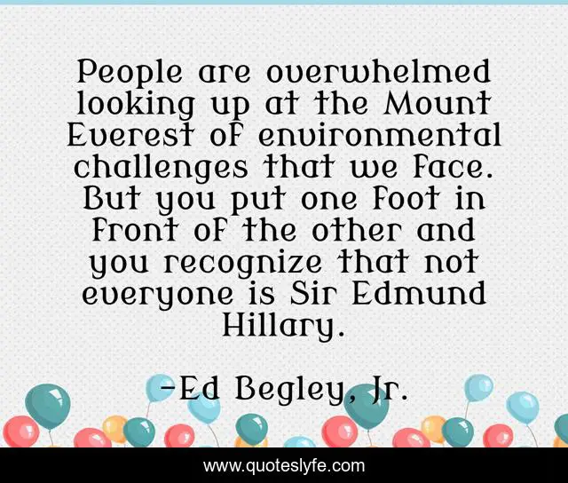 This page presents the quote "People are overwhelmed looking up at the Mount Everest of environmental challenges that we face. But you put one foot in front of the other and you recognize that not everyone is Sir Edmund Hillary.". Author of this quote is Ed Begley, Jr.. This quote is about challenges, looking, people,.