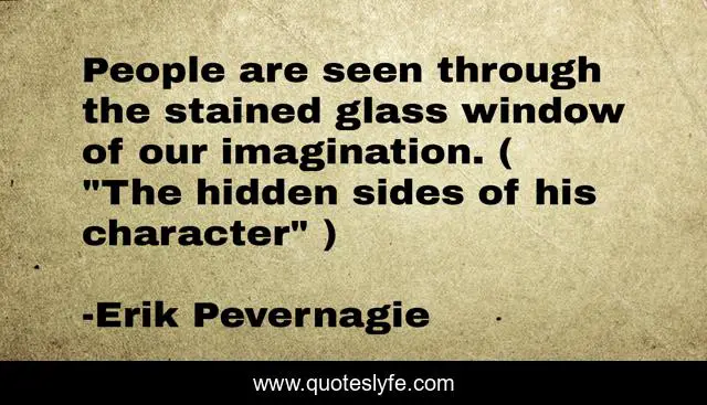 This page presents the quote "People are seen through the stained glass window of our imagination. ( "The hidden sides of his character" )". Author of this quote is Erik Pevernagie. This quote is about people, character, imagination, see, hidden, stained-glass-window,.