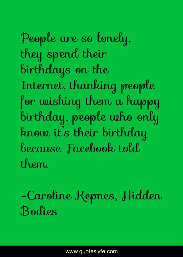 This page presents the quote "People are so lonely, they spend their birthdays on the Internet, thanking people for wishing them a happy birthday, people who only know it’s their birthday because Facebook told them.". Author of this quote is Caroline Kepnes, Hidden Bodies. This quote is about loneliness, birthdays,.