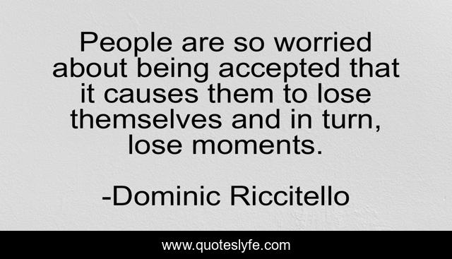 This page presents the quote "People are so worried about being accepted that it causes them to lose themselves and in turn, lose moments.". Author of this quote is Dominic Riccitello. This quote is about moments, quote, acceptance, lose-yourself, opinion, worth, thoughts, self-esteem,.