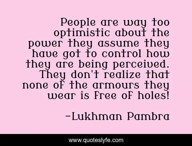 This page presents the quote "People are way too optimistic about the power they assume they have got to control how they are being perceived. They don't realize that none of the armours they wear is free of holes!". Author of this quote is Lukhman Pambra. This quote is about hypocrisy-in-everyone, confidence, shield, perception-of-self, overconfidence, fake-smile, optimism, hypocrite-hypocritical, image-about-yourself,.