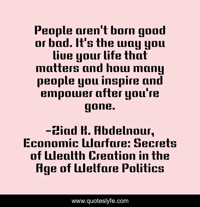 This page presents the quote "People aren't born good or bad. It's the way you live your life that matters and how many people you inspire and empower after you're gone.". Author of this quote is Ziad K. Abdelnour, Economic Warfare: Secrets of Wealth Creation in the Age of Welfare Politics. This quote is about empower, bad, good, life, inspire,.