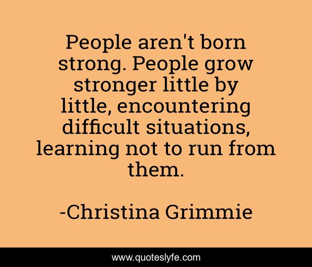 This page presents the quote "People aren't born strong. People grow stronger little by little, encountering difficult situations, learning not to run from them.". Author of this quote is Christina Grimmie. This quote is about strong, stronger, people,.