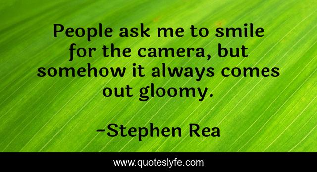 This page presents the quote "People ask me to smile for the camera, but somehow it always comes out gloomy.". Author of this quote is Stephen Rea. This quote is about me, camera, people,.