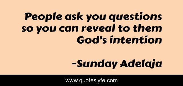 This page presents the quote "People ask you questions so you can reveal to them God’s intention". Author of this quote is Sunday Adelaja. This quote is about ask, god, intention, reveal, people,.