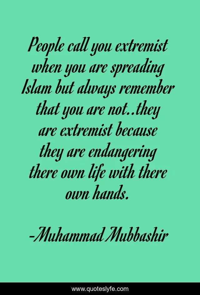 This page presents the quote "People call you extremist when you are spreading Islam but always remember that you are not..they are extremist because they are endangering there own life with there own hands.". Author of this quote is Muhammad Mubbashir. This quote is about religion, sprituality, islam,.