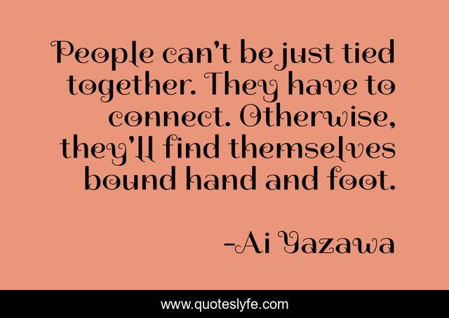 This page presents the quote "People can't be just tied together. They have to connect. Otherwise, they'll find themselves bound hand and foot.". Author of this quote is Ai Yazawa. This quote is about nana, connection, love, affection,.