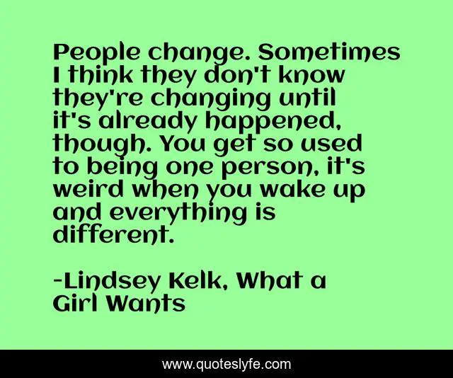 This page presents the quote "People change. Sometimes I think they don't know they're changing until it's already happened, though. You get so used to being one person, it's weird when you wake up and everything is different.". Author of this quote is Lindsey Kelk, What a Girl Wants. This quote is about life, love, romantic, photographer, hilarious, hawaii, impersonate, adventure, escape,.