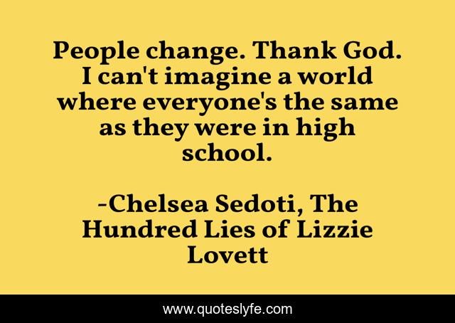 This page presents the quote "People change. Thank God. I can't imagine a world where everyone's the same as they were in high school.". Author of this quote is Chelsea Sedoti, The Hundred Lies of Lizzie Lovett. This quote is about change, lizzie-lovett, high-school-enzo-calvetti, hawthorn-creely,.