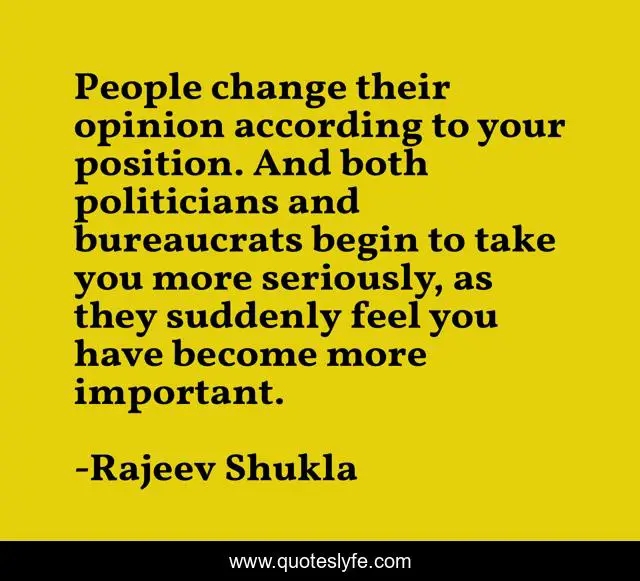 This page presents the quote "People change their opinion according to your position. And both politicians and bureaucrats begin to take you more seriously, as they suddenly feel you have become more important.". Author of this quote is Rajeev Shukla. This quote is about opinion, people,.