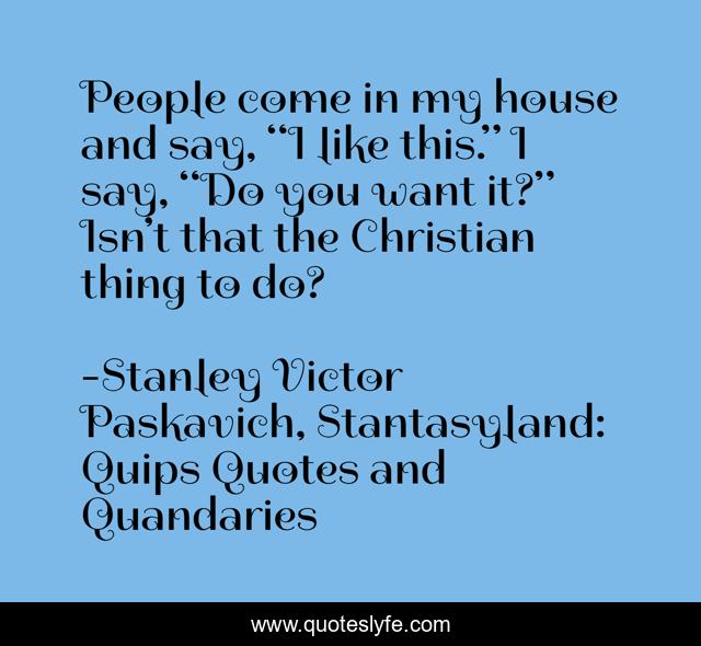This page presents the quote "People come in my house and say, “I like this.” I say, “Do you want it?” Isn’t that the Christian thing to do?". Author of this quote is Stanley Victor Paskavich, Stantasyland: Quips Quotes and Quandaries. This quote is about belongings, giving, sharing, christian,.