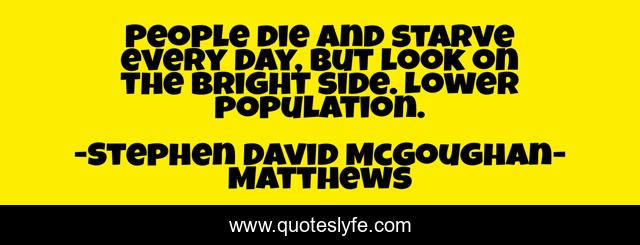 This page presents the quote "People die and starve every day, but look on the bright side. Lower population.". Author of this quote is Stephen David McGoughan-Matthews. This quote is about poop, love, help, beauty, inspirational, enthusiasm, affection,.
