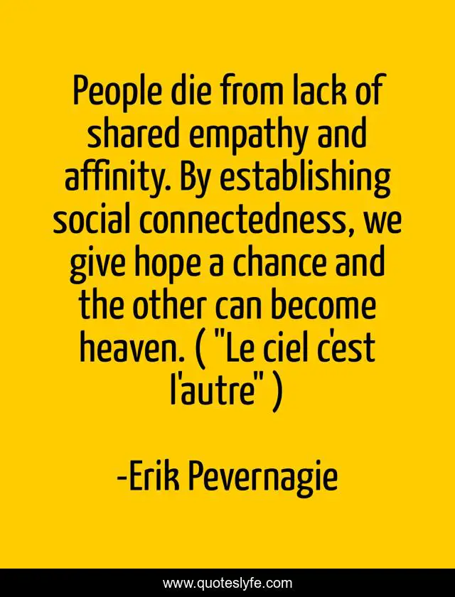 This page presents the quote "People die from lack of shared empathy and affinity. By establishing social connectedness, we give hope a chance and the other can become heaven. ( "Le ciel c'est l'autre" )". Author of this quote is Erik Pevernagie. This quote is about heaven, die, others, empathy, affinity, connectedness, social, hope,.