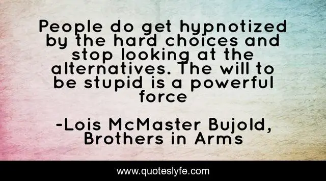 This page presents the quote "People do get hypnotized by the hard choices and stop looking at the alternatives. The will to be stupid is a powerful force". Author of this quote is Lois McMaster Bujold, Brothers in Arms. This quote is about choicespidity, choices,.