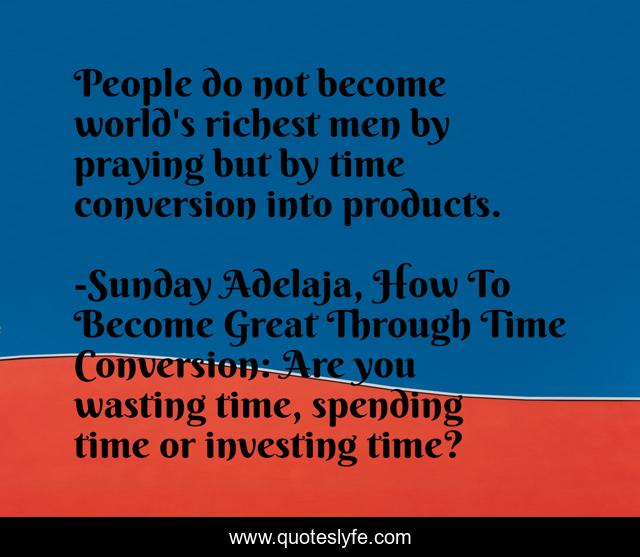 This page presents the quote "People do not become world's richest men by praying but by time conversion into products.". Author of this quote is Sunday Adelaja, How To Become Great Through Time Conversion: Are you wasting time, spending time or investing time?. This quote is about prayers, life, conversion, productivity, wealth, people, greatness, waste, humanity,.
