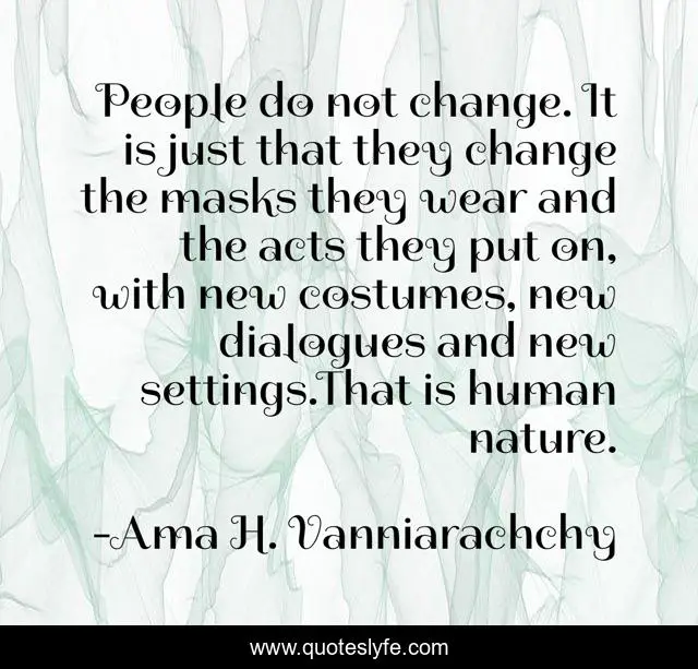 This page presents the quote "People do not change. It is just that they change the masks they wear and the acts they put on, with new costumes, new dialogues and new settings.That is human nature.". Author of this quote is Ama H. Vanniarachchy. This quote is about people, human-nature, betrayal, masks, ama-h-vanniarachchy, change,.