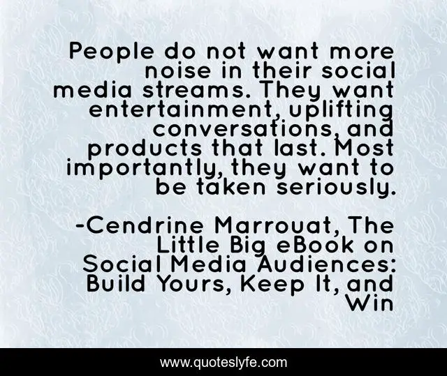 This page presents the quote "People do not want more noise in their social media streams. They want entertainment, uplifting conversations, and products that last. Most importantly, they want to be taken seriously.". Author of this quote is Cendrine Marrouat, The Little Big eBook on Social Media Audiences: Build Yours, Keep It, and Win. This quote is about social-media, social-customer-service, social-media-marketing, social-media-audiences, social-business,.