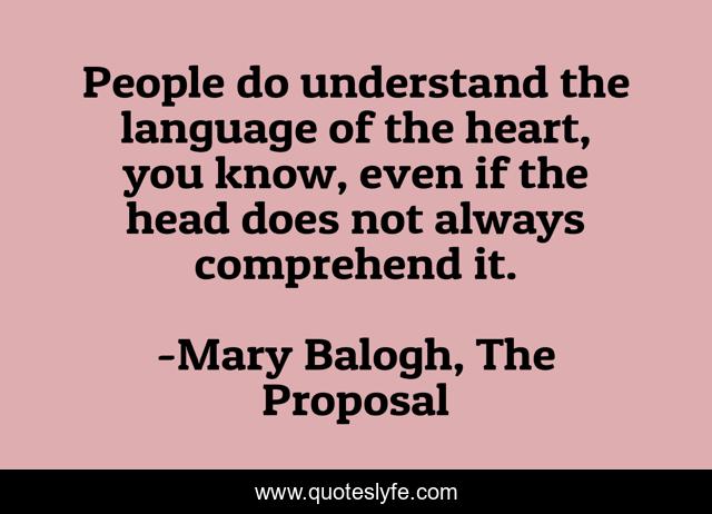 This page presents the quote "People do understand the language of the heart, you know, even if the head does not always comprehend it.". Author of this quote is Mary Balogh, The Proposal. This quote is about heart, love, romantic, regency, regency-romance, romance, passion, affection,.