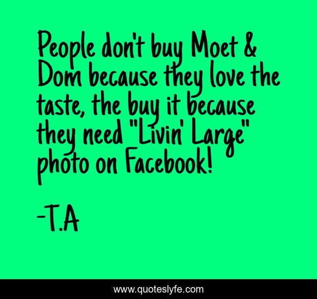 This page presents the quote "People don't buy Moet & Dom because they love the taste, the buy it because they need "Livin' Large" photo on Facebook!". Author of this quote is T.A. This quote is about living, life, facebook,.