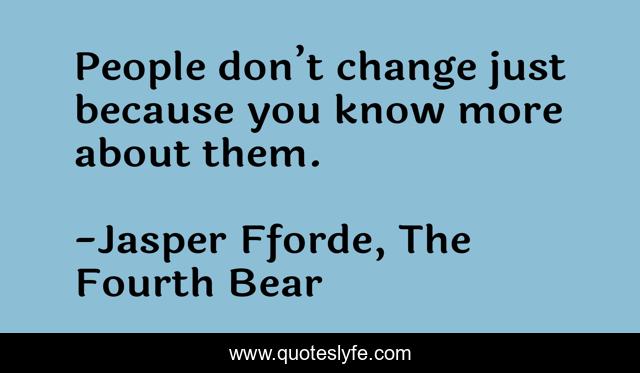 This page presents the quote "People don’t change just because you know more about them.". Author of this quote is Jasper Fforde, The Fourth Bear. This quote is about life, friendship, relationship, people,.