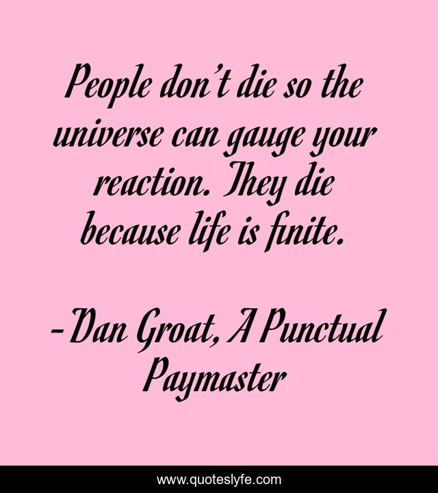 This page presents the quote "People don’t die so the universe can gauge your reaction. They die because life is finite.". Author of this quote is Dan Groat, A Punctual Paymaster. This quote is about reaction, life, death, universe, finite-life, die, finite,.