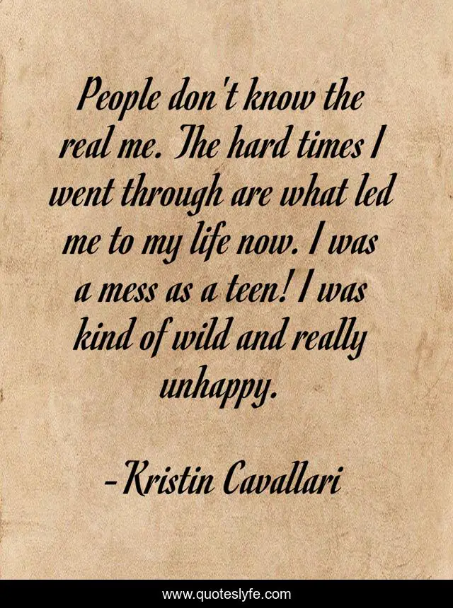 This page presents the quote "People don't know the real me. The hard times I went through are what led me to my life now. I was a mess as a teen! I was kind of wild and really unhappy.". Author of this quote is Kristin Cavallari. This quote is about me, life, people,.