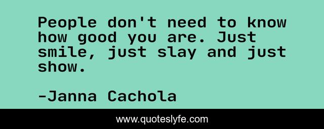 This page presents the quote "People don't need to know how good you are. Just smile, just slay and just show.". Author of this quote is Janna Cachola. This quote is about confidence, slay, girl-power, motivation, quotes, just-do-it, humility,.