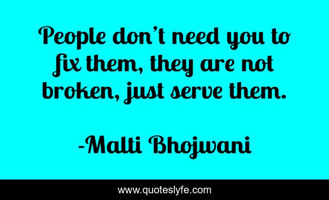 This page presents the quote "People don’t need you to fix them, they are not broken, just serve them.". Author of this quote is Malti Bhojwani. This quote is about coaching, coach, serve, leader, leadership,.
