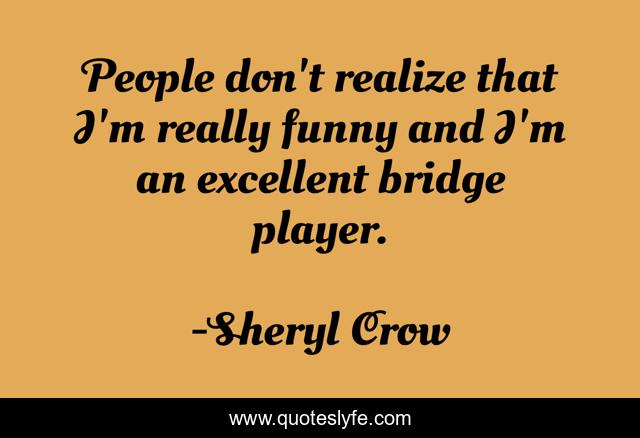 This page presents the quote "People don't realize that I'm really funny and I'm an excellent bridge player.". Author of this quote is Sheryl Crow. This quote is about bridge, realize, people,.