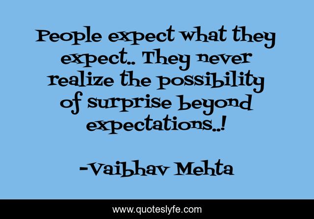 This page presents the quote "People expect what they expect.. They never realize the possibility of surprise beyond expectations..!". Author of this quote is Vaibhav Mehta. This quote is about surprise, expectations, expect, people,.