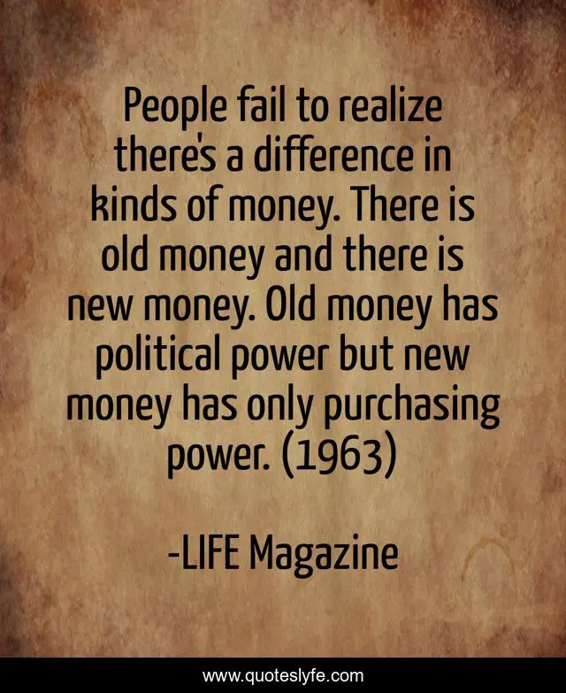This page presents the quote "People fail to realize there's a difference in kinds of money. There is old money and there is new money. Old money has political power but new money has only purchasing power. (1963)". Author of this quote is LIFE Magazine. This quote is about subtlety, leadership, influence,.
