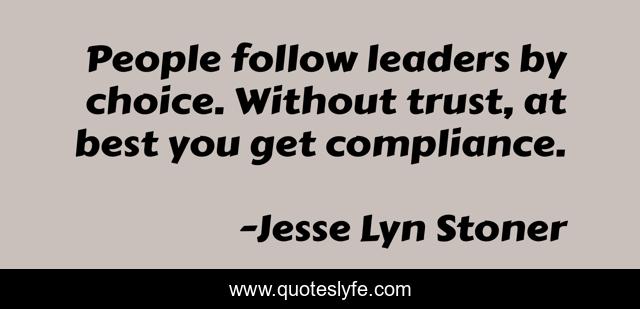 "Jesse Lyn Stoner Quotes." Quoteslyfe.com, 2025. Sat. 06 Dec. 2025. <https://www.quoteslyfe.com/quote/People-follow-leaders-by-choice-Without-trust-64255>.