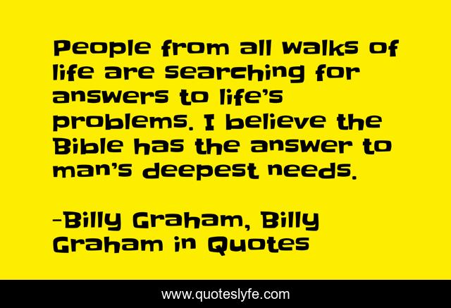 This page presents the quote "People from all walks of life are searching for answers to life’s problems. I believe the Bible has the answer to man’s deepest needs.". Author of this quote is Billy Graham, Billy Graham in Quotes. This quote is about bible, billy-graham,.