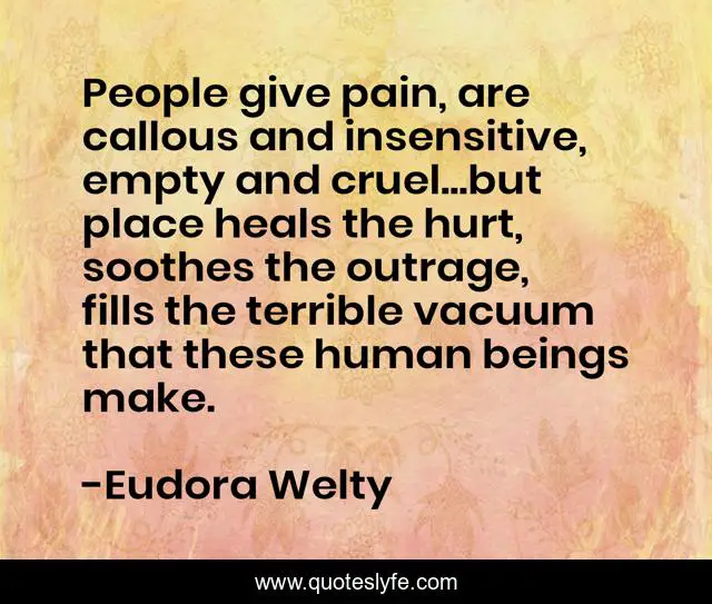 This page presents the quote "People give pain, are callous and insensitive, empty and cruel...but place heals the hurt, soothes the outrage, fills the terrible vacuum that these human beings make.". Author of this quote is Eudora Welty. .