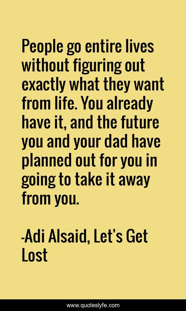 This page presents the quote "People go entire lives without figuring out exactly what they want from life. You already have it, and the future you and your dad have planned out for you in going to take it away from you.". Author of this quote is Adi Alsaid, Let's Get Lost. This quote is about let-s-get-lost, life, future, adi-alsaid,.