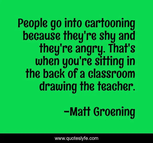This page presents the quote "People go into cartooning because they're shy and they're angry. That's when you're sitting in the back of a classroom drawing the teacher.". Author of this quote is Matt Groening. This quote is about angry, drawing, people,.