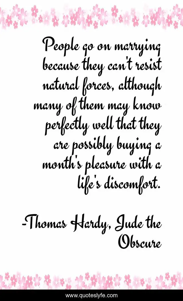 This page presents the quote "People go on marrying because they can't resist natural forces, although many of them may know perfectly well that they are possibly buying a month's pleasure with a life's discomfort.". Author of this quote is Thomas Hardy, Jude the Obscure. This quote is about nature, matrimony, force-of-nature, discomfort, marriage, self-deception, pleasure,.