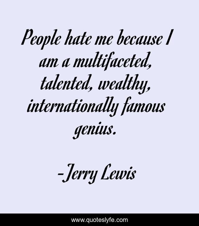 This page presents the quote "People hate me because I am a multifaceted, talented, wealthy, internationally famous genius.". Author of this quote is Jerry Lewis. This quote is about me, hate,.