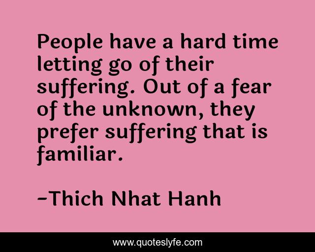 This page presents the quote "People have a hard time letting go of their suffering. Out of a fear of the unknown, they prefer suffering that is familiar.". Author of this quote is Thich Nhat Hanh. This quote is about fear, suffering, people,.