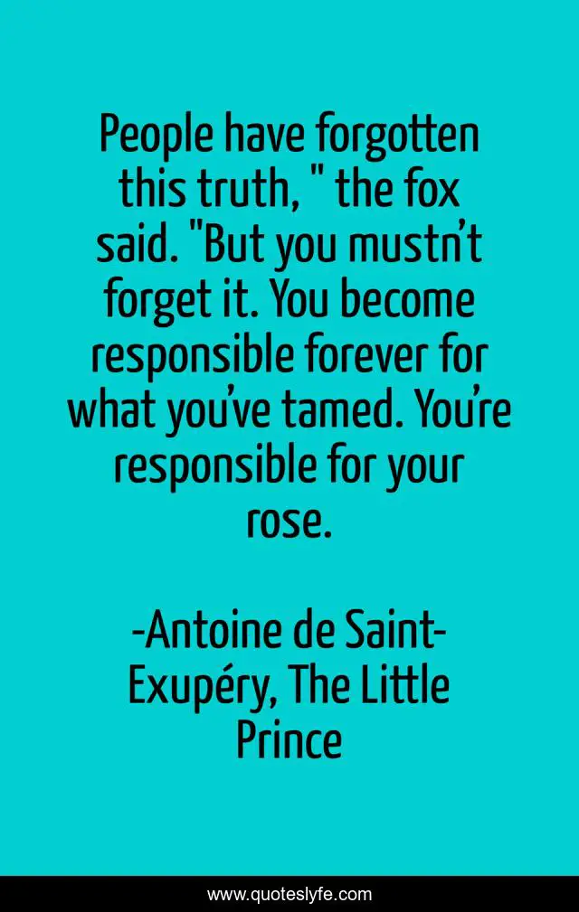 People have forgotten this truth, " the fox said. "But you mustn’t forget it. You become responsible forever for what you’ve tamed. You’re responsible for your rose.