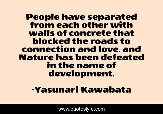 This page presents the quote "People have separated from each other with walls of concrete that blocked the roads to connection and love. and Nature has been defeated in the name of development.". Author of this quote is Yasunari Kawabata. This quote is about development, japanese-literature, love, civilization, japan, affection,.