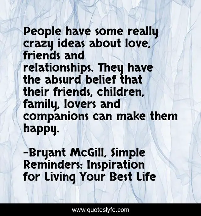 This page presents the quote "People have some really crazy ideas about love, friends and relationships. They have the absurd belief that their friends, children, family, lovers and companions can make them happy.". Author of this quote is Bryant McGill, Simple Reminders: Inspiration for Living Your Best Life. This quote is about relationships, love, companionship, craziness, ideas, happiness, absurdity, affection,.