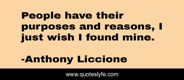 This page presents the quote "People have their purposes and reasons, I just wish I found mine.". Author of this quote is Anthony Liccione. This quote is about goal, reasons, drive, aim, purpose-in-life, directions,.
