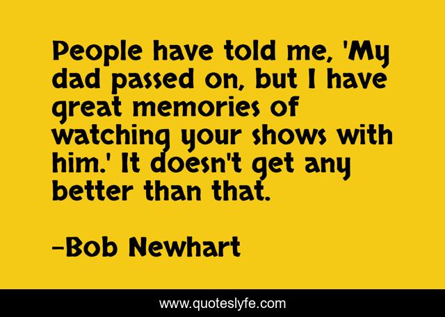 This page presents the quote "People have told me, 'My dad passed on, but I have great memories of watching your shows with him.' It doesn't get any better than that.". Author of this quote is Bob Newhart. This quote is about me, memories, great,.