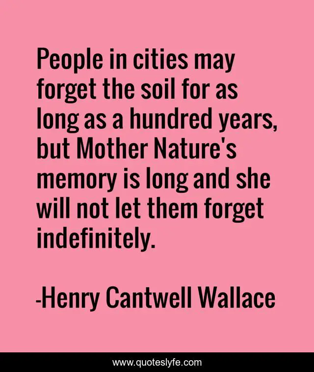 This page presents the quote "People in cities may forget the soil for as long as a hundred years, but Mother Nature's memory is long and she will not let them forget indefinitely.". Author of this quote is Henry Cantwell Wallace. This quote is about people, mother, memory,.