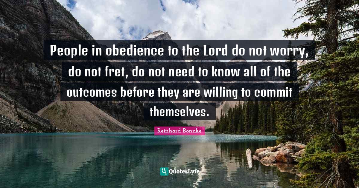 This page presents the quote "People in obedience to the Lord do not worry, do not fret, do not need to know all of the outcomes before they are willing to commit themselves.". Author of this quote is Reinhard Bonnke. This quote is about willing, lord, obedience, commit, people, worry, outcomes,.