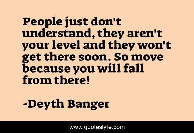 This page presents the quote "People just don't understand, they aren't your level and they won't get there soon. So move because you will fall from there!". Author of this quote is Deyth Banger. This quote is about fall, people, understand, level,.