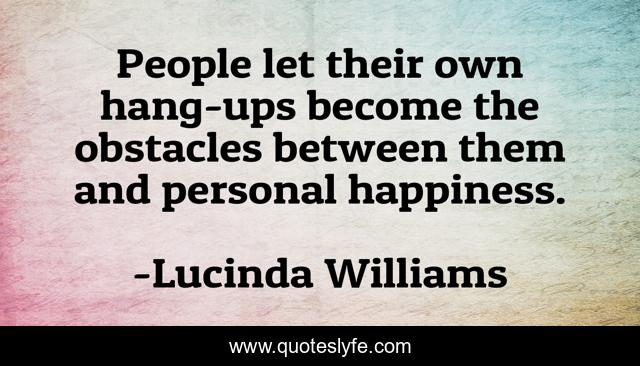 This page presents the quote "People let their own hang-ups become the obstacles between them and personal happiness.". Author of this quote is Lucinda Williams. This quote is about personal, obstacles, people,.